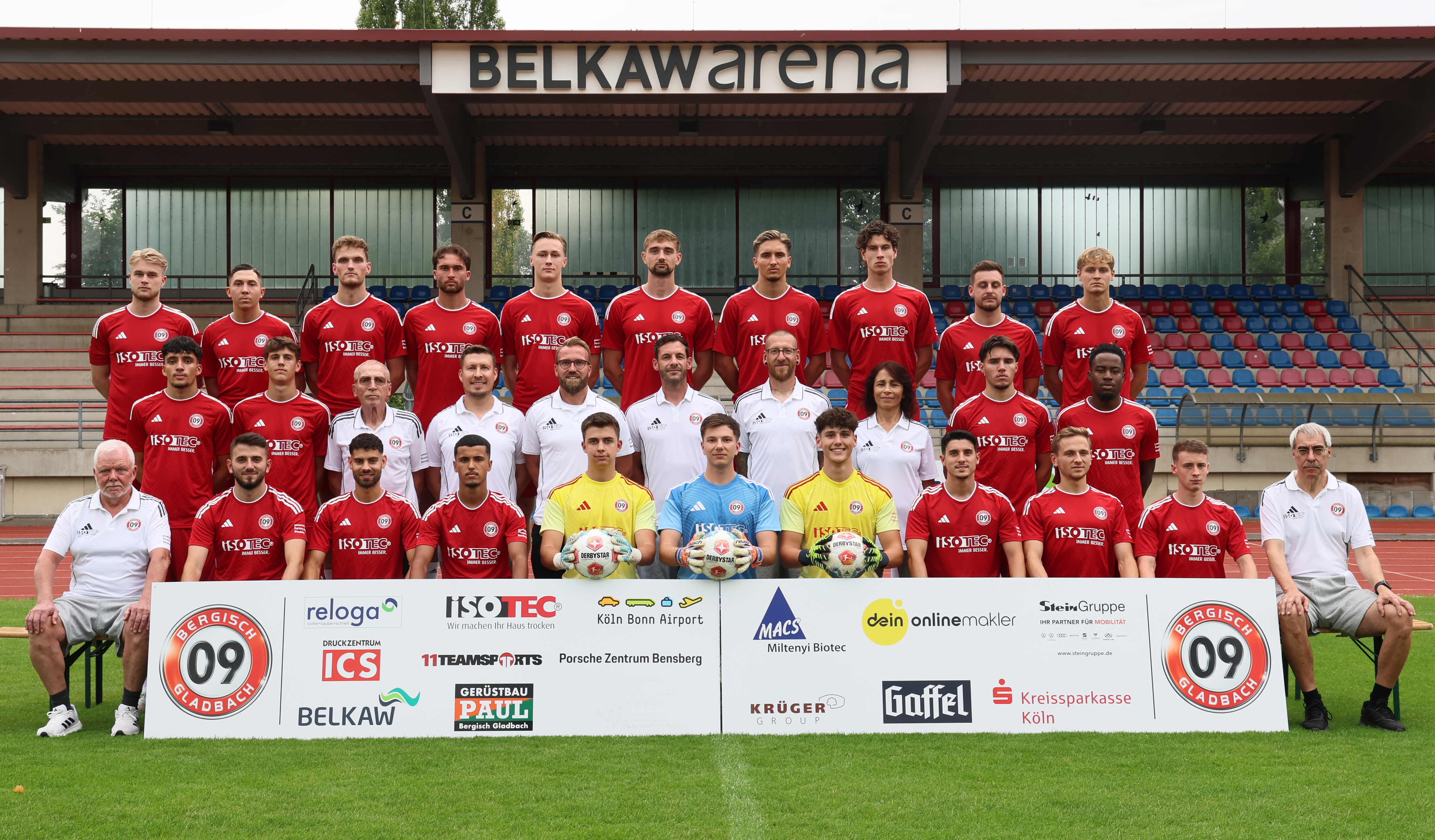 Mittlere Reihe (v. li.): Azem Memeti, Ole Tillmann, Betreuer Bert Demond, Mannschaftsarzt Dr. Christopher Wallraff, Sportdirektor Christian Schlösser, Trainer Kevin Kruth, Torwart-Trainer Uwe Haselhuhn, Teammanagerin Zeliha Metin, Elyas Aydin, Jeffrey St. Louis